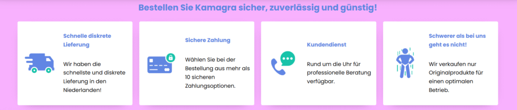 kamagrabestelleneu.de konzentriert sich auf die Lieferung in die Niederlande, nach Belgien und Deutschland, wo ein diskreter und schneller Versand ohne Rezept möglich ist. Der Webshop liefert aufgrund lokaler Vorschriften und Versandbeschränkungen grundsätzlich nicht in andere europäische Länder. Für eine sichere, legale und private Lieferung bleibt kamagrabestellen.eu innerhalb der unterstützten Regionen die empfohlene Option.